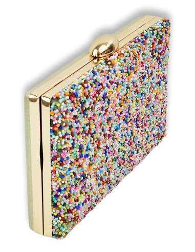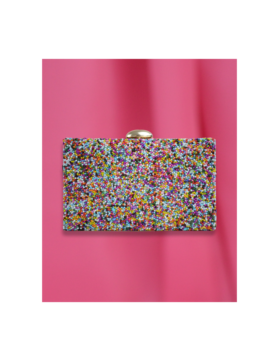 Esta clutch sofisticada é o acessório perfeito para realçar qualquer look. A sua face é adornada com um intrincado acabamento em missangas coloridas, criando um padrão vibrante e único. A parte de trás, com o seu acabamento dourado, complementado pelos metais dourados. Em multicores podera combinar com varios looks.
