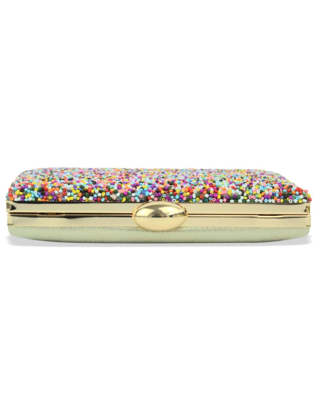 Esta clutch sofisticada é o acessório perfeito para realçar qualquer look. A sua face é adornada com um intrincado acabamento em missangas coloridas, criando um padrão vibrante e único. A parte de trás, com o seu acabamento dourado, confere um toque de glamour intemporal, complementado pelos metais dourados que realçam a sua elegância.