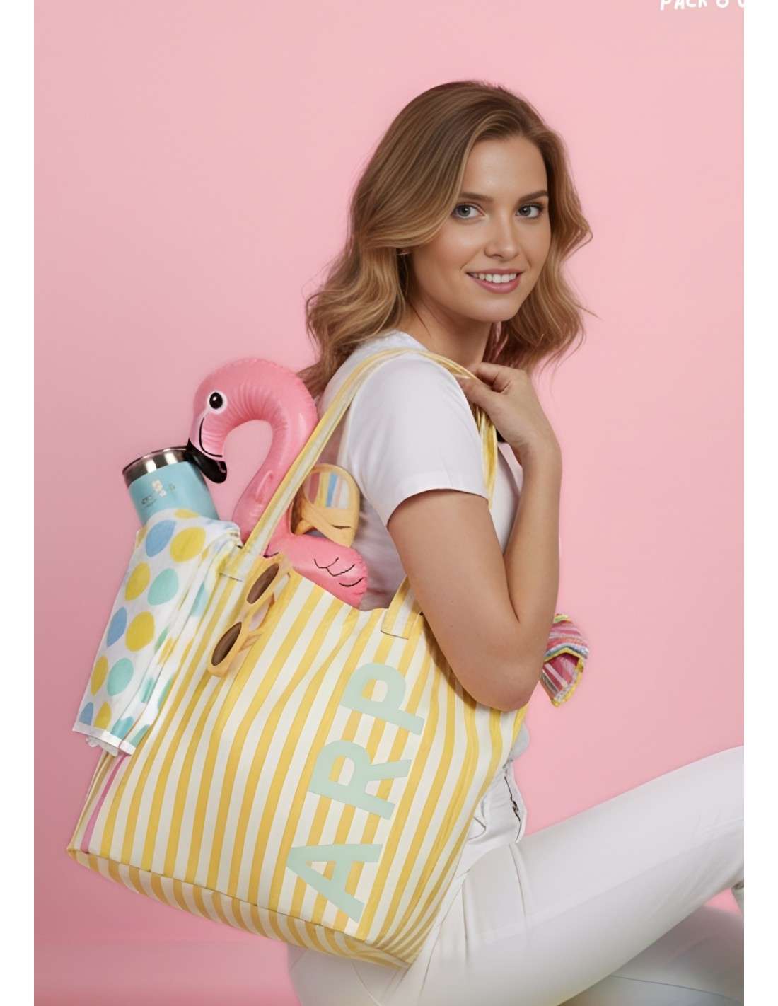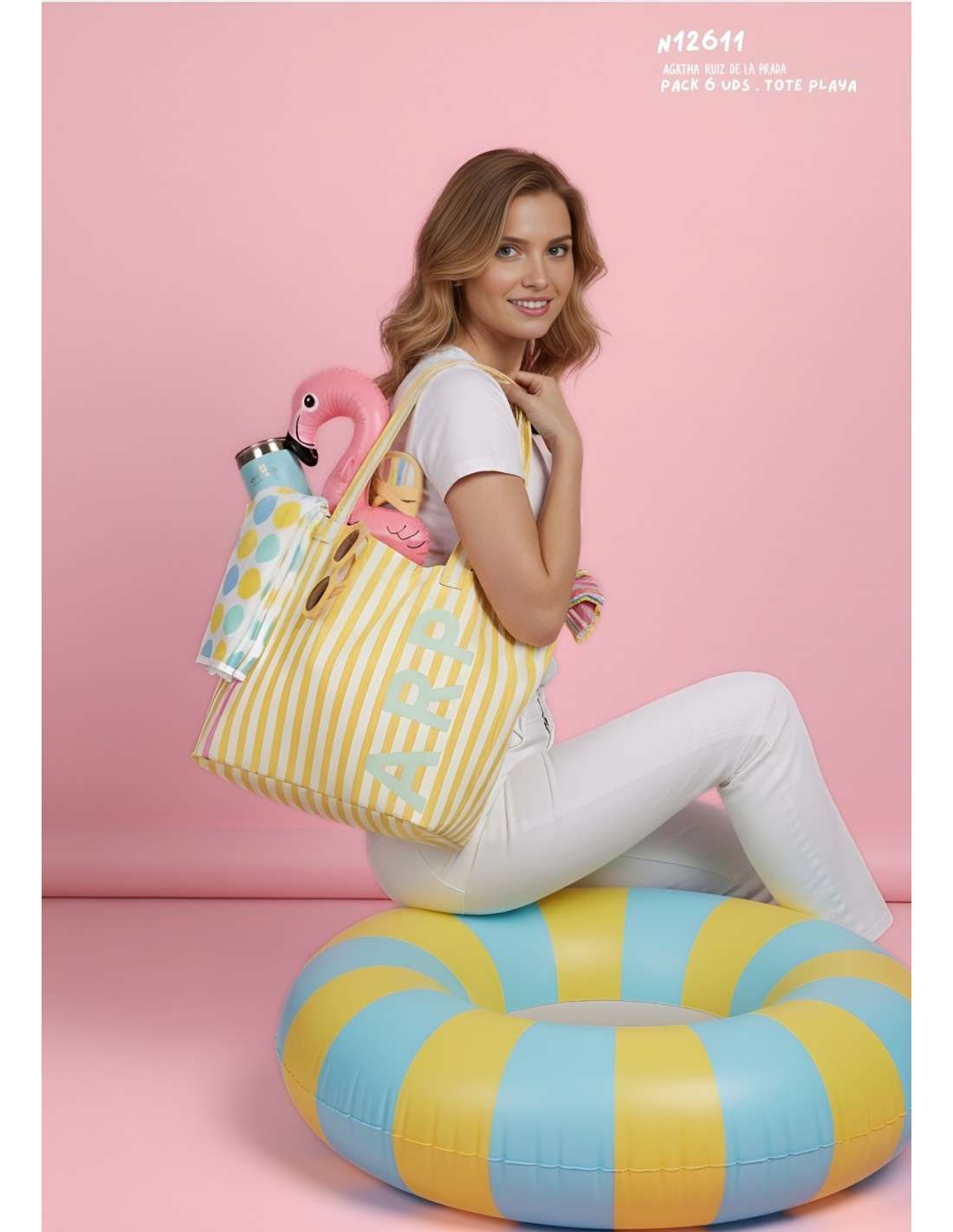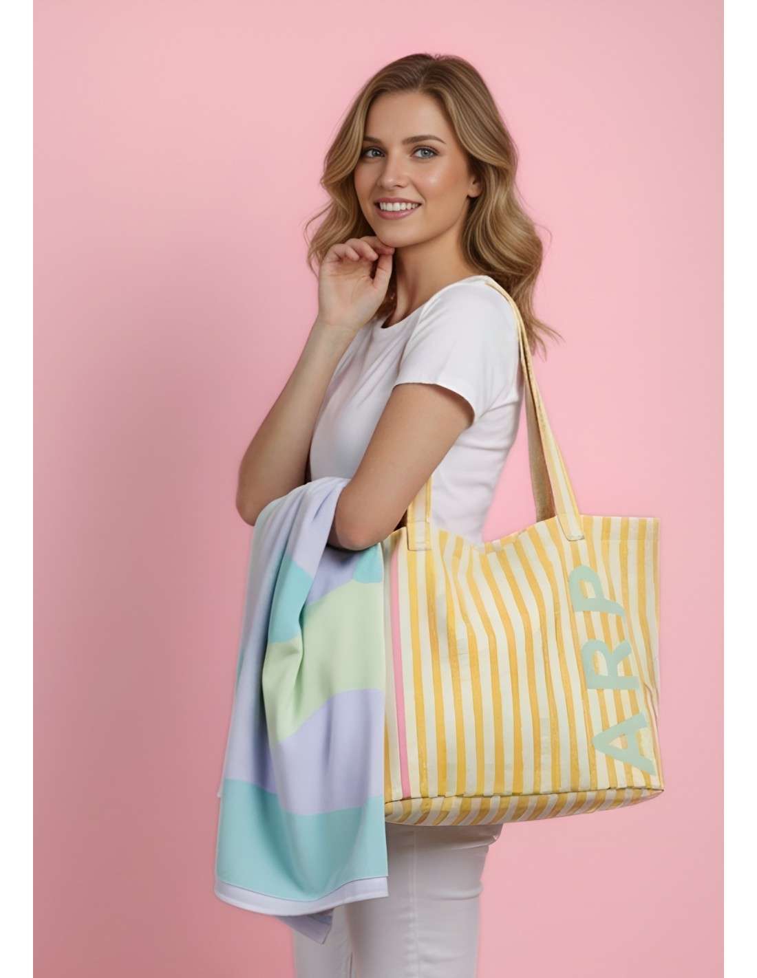 Mala de riscas Agatha Ruiz de la Prada: estilo navy vibrante com as iniciais ARP. Espaçosa e em lona, é a companhia ideal para o verão e para a praia!
