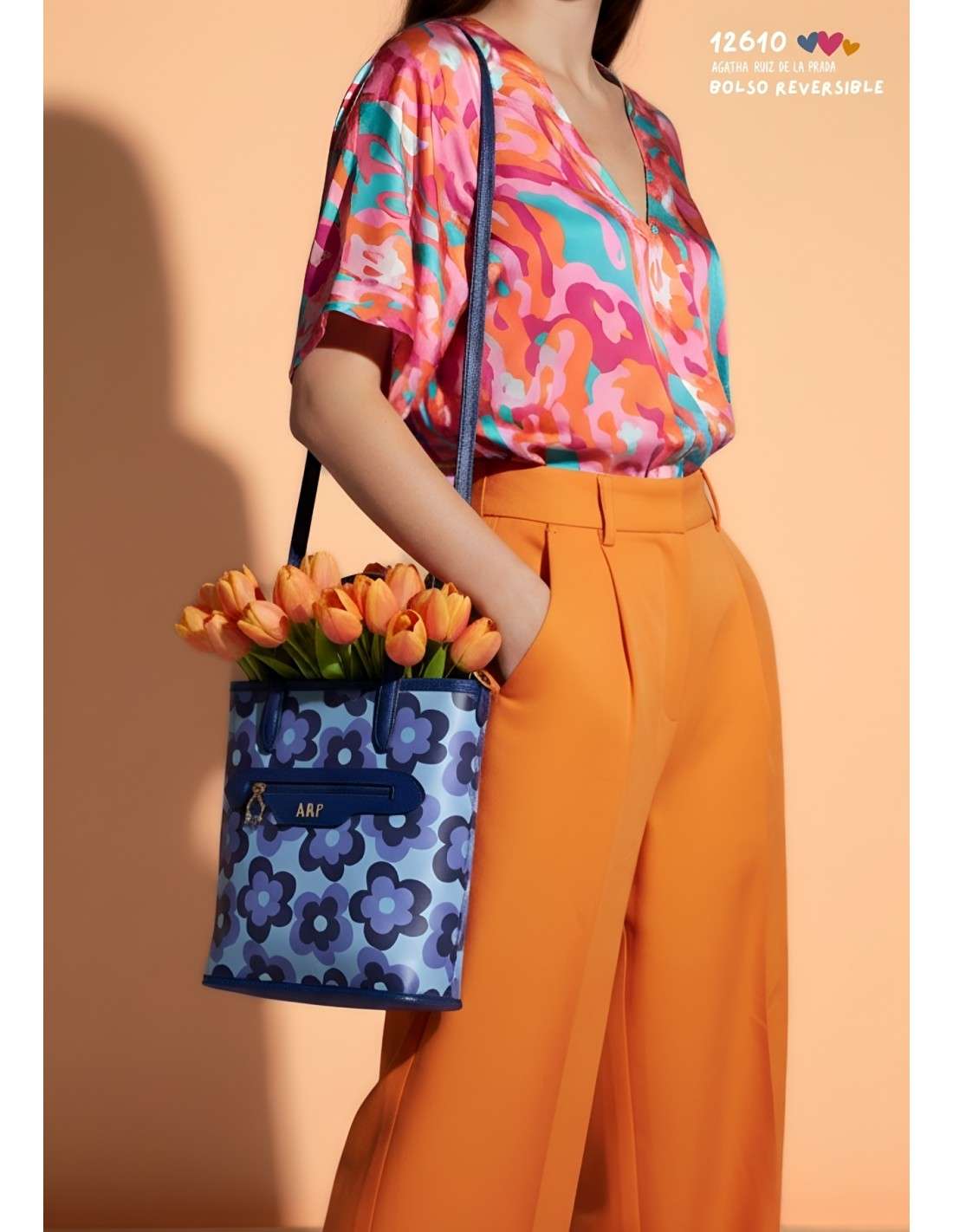 Mala reversível Agatha Ruiz de la Prada: padrão floral vibrante, bolso frontal com iniciais ARP e design 2 em 1. Versatilidade e cor num só acessório!