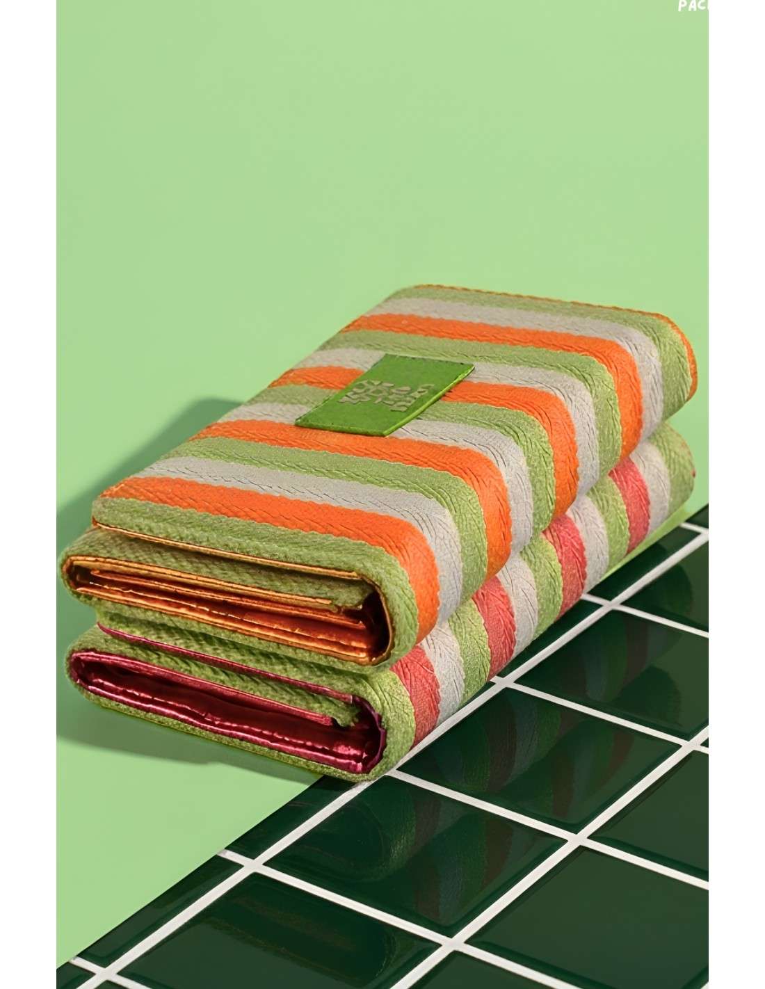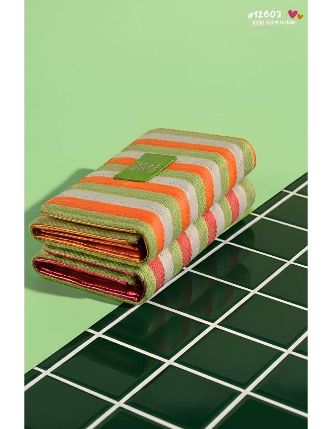 Mantenha os seus essenciais organizados com a carteira Agatha Ruiz de la Prada. Este acessório destaca-se pelo seu padrão icónico de riscas multicoloridas em tons de verde, laranja e rosa, apresentando um acabamento texturizado que confere um toque premium e moderno.