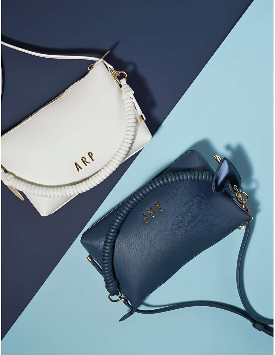 Para um estilo mais sóbrio, mas igualmente luxuoso, a linha Elegance Monogram apresenta carteiras em pele sintética de grão fino. O destaque vai para a faixa central metalizada que ostenta as iniciais "ARP" em letras douradas tridimensionais, garantindo um visual premium.