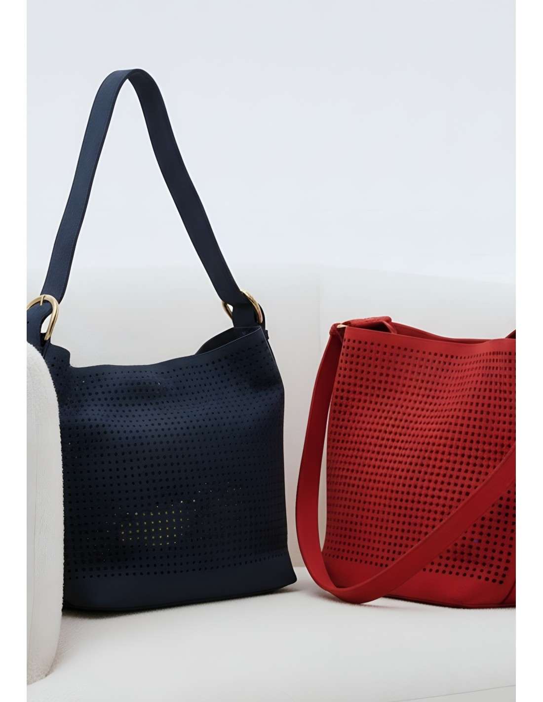Mala ombro NOCO camurça perfurada com forro e fecho de correr e logótipo metálico. Design compacto e sofisticado, disponível em cores clássicas de verão.