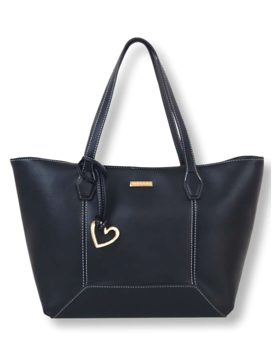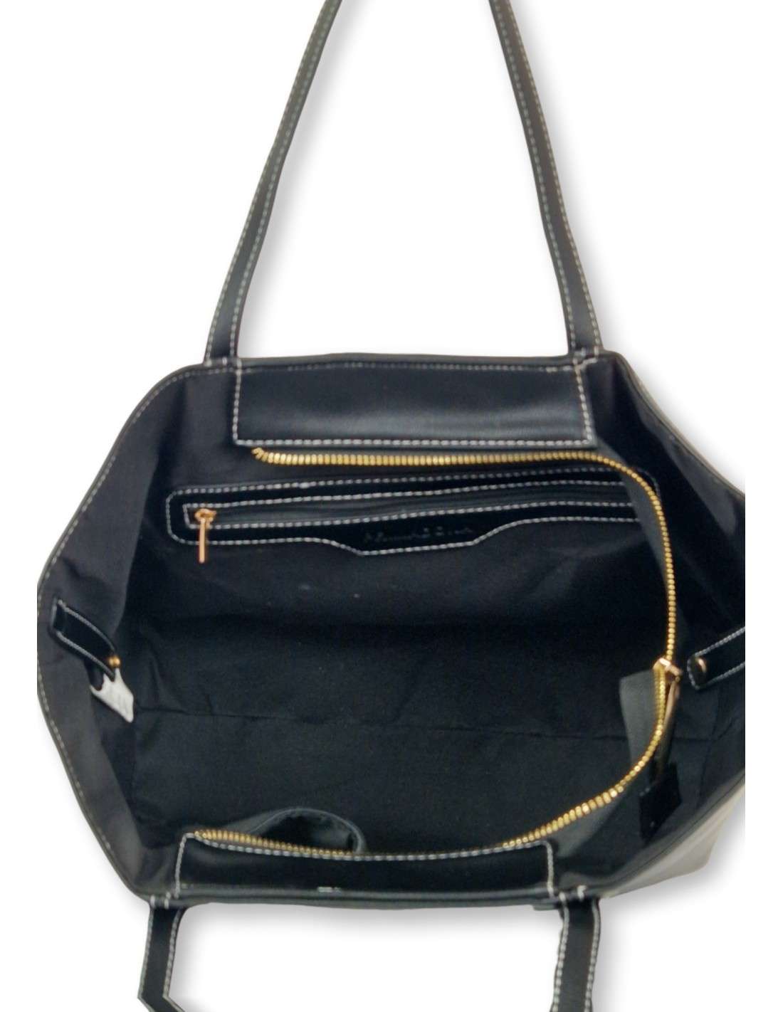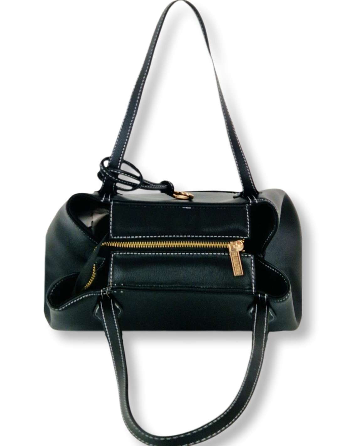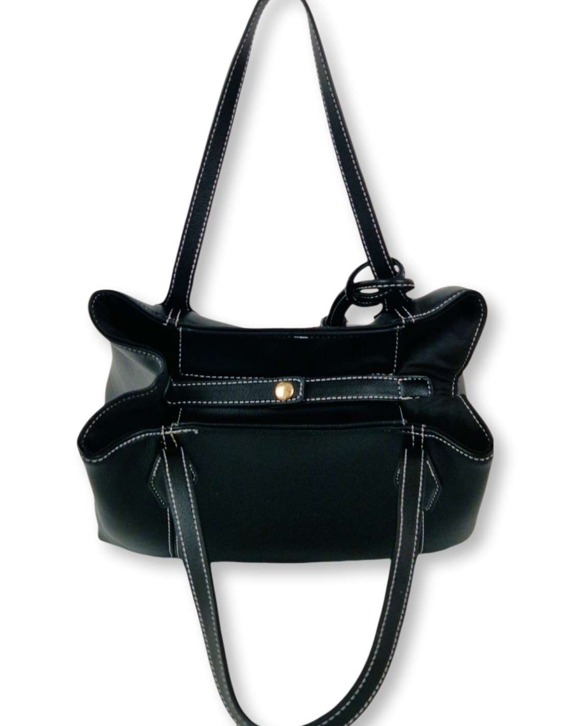 Mala Grande Primadona É uma mala grande e espaçosa, perfeita para o dia a dia, em pele sintética preta de qualidade, destaca-se pelo contraste elegante das alças bege e os rebordos em granate, adicionando um toque de sofisticação. O fecho dourado complementa o design, enquanto o interior amplo com bolsos laterais garante organização. 27x29x14 cm (largura...
