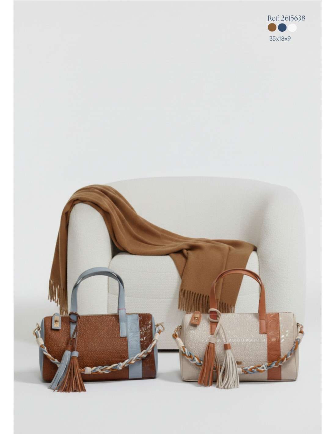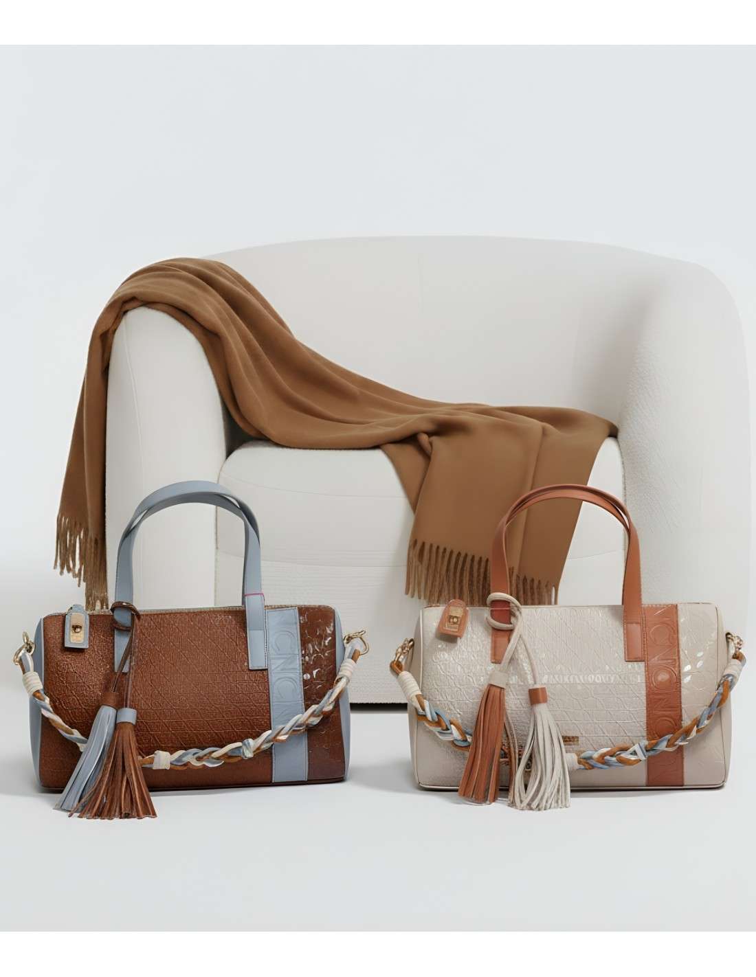 ​O grande destaque deste modelo é a sua alça decorativa frontal trançada em tons multicoloridos, finalizada com barretas (tassels) pendentes que adicionam um toque artesanal e dinâmico. Com alças de mão curtas e resistentes, além de uma alça tiracolo removível, esta mala oferece versatilidade para diferentes ocasiões, desde o trabalho até um passeio de fim de semana.