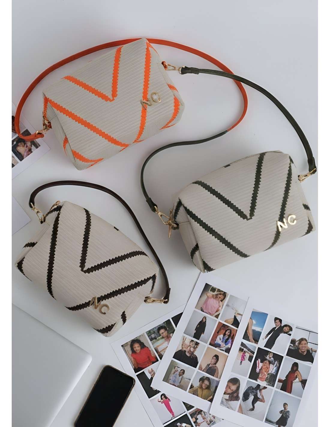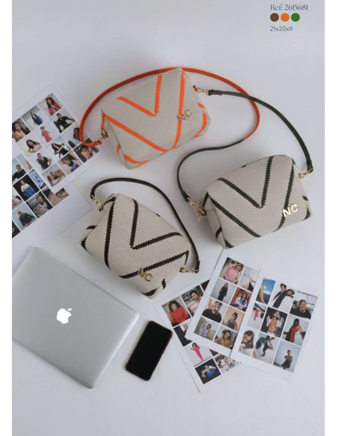 Cores Disponíveis: Castanho, Laranja e Verde (detalhes do padrão e alça)